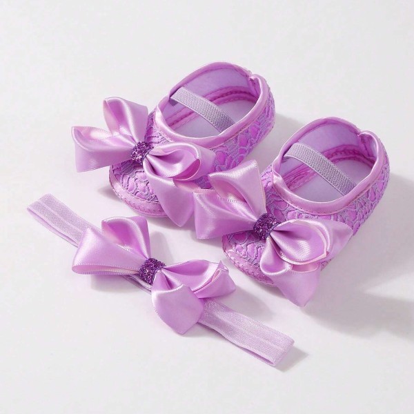 ০-১২ মাস মেয়ে বাবুর জন্য Princess Bow Design Baby Shoes With Hairband Purple