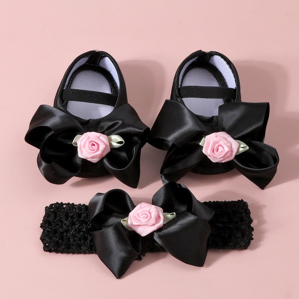 ০-১২ মাস মেয়ে বাবুর জন্য Single Rose Shoes With Hairband Black
